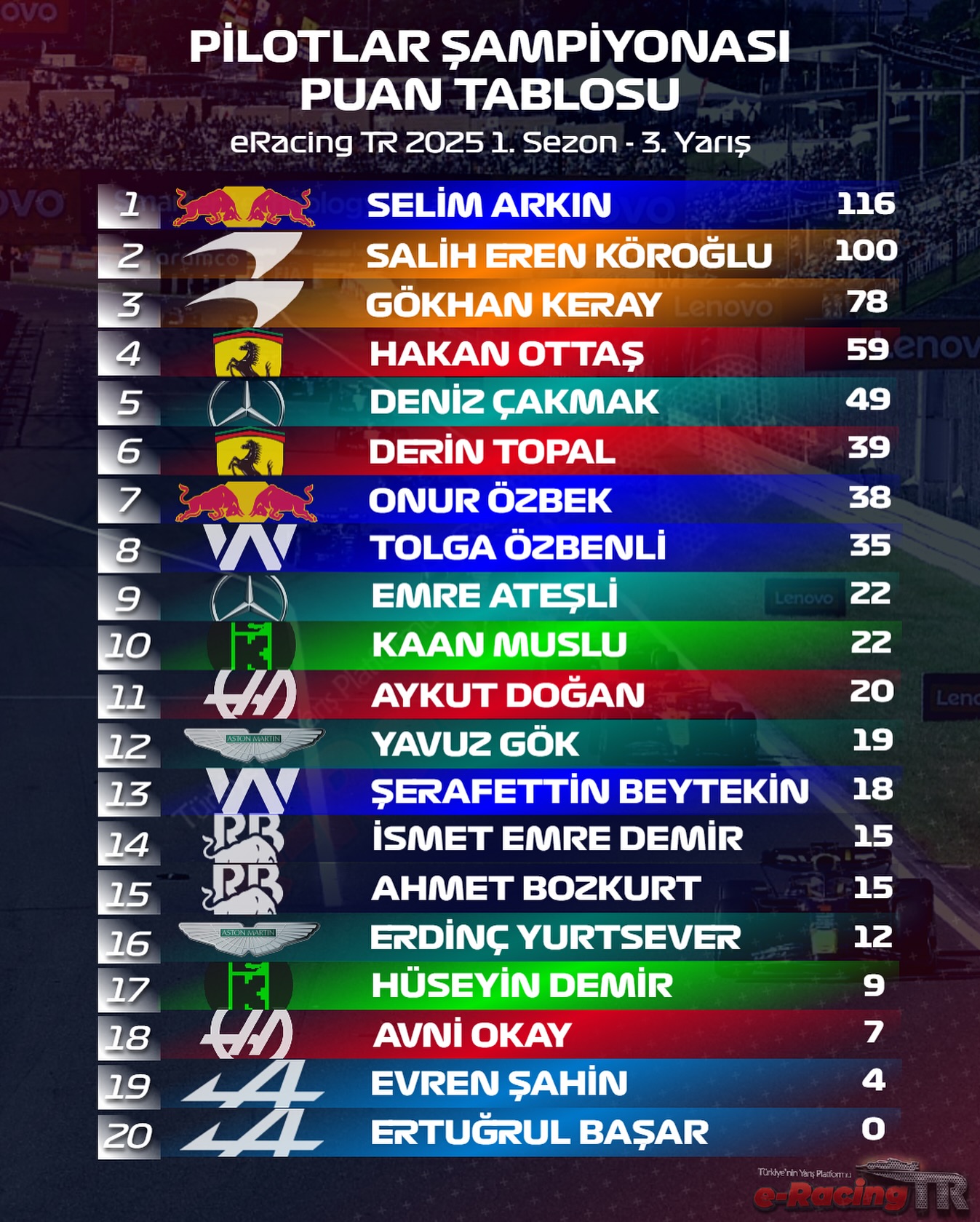 Geride kalan 3 yarış sonunda pilotlar puan durumu. 📊